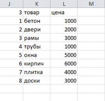 4. Чтобы вывести в В1 наименование товара, а не номер, и затем в ячейке В2 цену, нужно использовать функцию ВПР или ПРОСМОТР, которая в зависимости от номера выбранной из списка работы в ячейке J1, будет возвращать соответствующее значение из второго и третьего столбцов таблицы. Например, формула в В1 будет следующей: =ПРОСМОТР(J1;$J$2:$J$10;$K$2:$K$10) или =ВПР(J1;$J$2:$L$10;2).