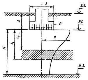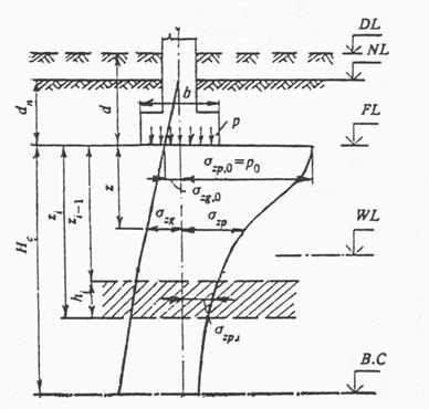 DL - отметка планировки; NL - отметка поверхности природного рельефа; FL - отметка подошвы фундамента; WL - уровень подземных вод; В,С - нижняя граница сжимаемой толщи; d и dn глубина заложения фундамента соответственно от уровня планировки и поверхности природного рельефа; b - ширина фундамента; р - среднее давление под подошвой фундамента; р 0 - дополнительное давление на основание; szg и szg, 0 - дополнительное вертикальное напряжение от внешней нагрузки на глубине z от подошвы фундамента и на уровне подошвы; szp и szр, 0 - дополнительное вертикальное напряжение от внешней нагрузки на глубине z от подошвы фундамента и на уровне подошвы; Нс - глубина сжимаемой толщи