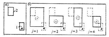 а - схема расположения рассчитываемого 1 и влияющего фундамента 2; б - схема расположения фиктивных фундаментов с указанием знака напряжений szр,cj в формуле (4) под углом i- го фундамента.