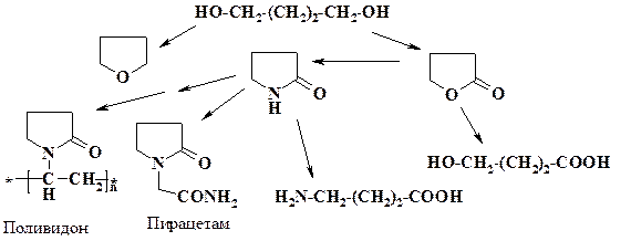 Однако эти процессы были вытеснены более дешевыми методами. Из 1,4-бутандиола получают тетрагидрофуран и g-бутиролактон, из которого синтезируют препарат оксибутират натрия (натриевая соль g-гидроксимасляной кислоты) и a-пироллидон. Из последнего получают препарат g-аминомасляную кислоту, являющийся нейромедиатором. Это соединение случит в качестве промежуточного продукта в синтезе препаратов пирацетам (ноотропил) и поливинилпирролидон (поливидон):