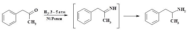 При получении препарата амфетамин (фенамин, вляется стимулятором деятельности ЦНС, снижает аппетит, снимает сонливость) в одном реакторе из 1-фенилпропа-2-она в 15% аммиаке образуется соответствующий имин и далее он восстанавливается водородом на скелетном никеле до фенилпропиламина.