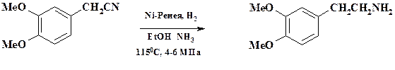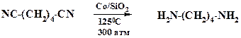 В этом случае используют кобальтовый катализатор, нанесенный на силикагель. Однако, по сравнению с использованием никеля, приходится увеличивать давление водорода до 30 МПа. В синтезе препаратов папаверин и хлорпромазин (аминазин) нитрильную группу восстанавливают водородом на никелевом катализаторе.