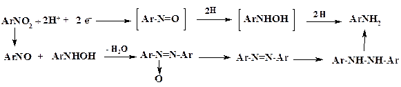Нитрозобензол реагирует фенилгидроксиламином давая азоксибензол, который восстанавливается до азобензола и далее до гидразобензола и анилина.