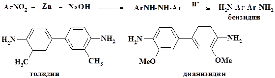 Аналогично при восстановлении о -нитротолуола и анизола получали толидин и анизидин. Бензидин и его производные широко использовались в производстве азокрасителей. Но после того как у бензидина были найдены канцерогенные свойства, его производство было прекращено.