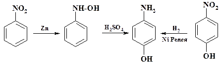 При подкислении реакционной массы гидроксиламинопроизводное межмолекулярно перегруппировывается в п -аминофенол. Однако при получении парацетамола это соединение получают с помощью жидкофазного каталитического гидрирования на никеле Ренея п -нитрофенола.