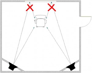 Наиболее критичной в этом отношении является задняя стена контрольной комнаты, поскольку она практически под прямым углом принимает на себя всю энергию излучаемых звуковых волн от мониторной системы, а всё, что возвращается от этой стены, будет окрашивать воспринимаемый в комнате звук. Не менее критичным является и потолок, так как он расположен напротив отражающего звук пола. Критичными являются также боковые стены, особенно их отрезки от фронтальной стены до условной линии, которая, являясь параллельной фронтальной стене, пересекает позицию звукоинженера.