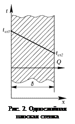 Теплопроводность через плоскую стенку. Рассмотрим наиболее распространенный случай – теплопроводность через плоскую однослойную стенку, длина и ширина которой бесконечно велики по сравнению с ее толщиной δ (рис. 2).