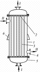 Кожухотрубный вертикальный теплообменник с неподвижными трубными решетками (жесткой конструкции) состоит из цилиндрического корпуса, или кожуха 1, к которому с двух сторон приварены трубные решетки 2 (рис. 6). В трубных решетках закреплен пучок труб 3. К кожуху с помощью фланцев присоединены болтами крышки 5. Для ввода и вывода теплоносителей к корпусу (кожуху) и крышкам приварены патрубки 4. Теплообменник устанавливают на опорных лапах 6. Один поток теплоносителя (I) направляется через патрубок в нижнюю камеру, проходит по трубкам и выходит через патрубок в верхней камере, т. е. движется в трубном пространстве. Другой поток теплоносителя (II) вводится через верхний патрубок на кожухе в межтрубное пространство теплообменника, омывает снаружи трубы и выводится через нижний патрубок, т. е. движется в межтрубном пространстве. Теплота от одного теплоносителя к другому передается через стенки труб.