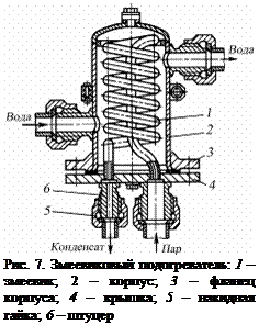 Змеевиковые теплообменники используют в основном для подогрева воды. Змеевиковый водоподогреватель (рис. 7) состоит из змеевика 1, расположенного в корпусе 2, фланца 3 и крышки 4, к которой прикреплен змеевик. К отверстиям, расположенным на крышке 4, плотно прижимаются с помощью накидных гаек 5 штуцера 6 для подвода пара и отвода образующегося конденсата.