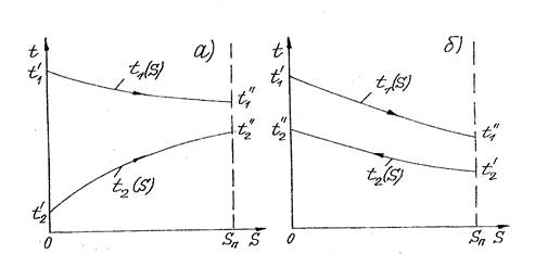 в прямоточном (а) и противоточном (б) теплообменниках, S - текущая поверхность теплообмена,