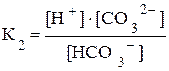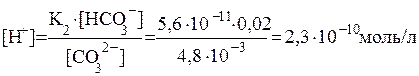 Зная концентрации ионов СО32- и НСО3-, вычисляем концентрацию ионов [Н+] из уравнения для константы диссоциации Н2СО3 по второй ступени: