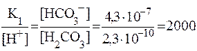Таким образом, при данном рН концентрация ионов НСО3- приблизительно в 2000 раз превышает концентрацию молекул Н2СО3. Значит образованием молекул Н2СО3 можно пренебречь.
