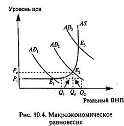 После анализа совокупного спроса и совокупного предложения можно обратиться к проблеме макроэкономического равновесия — состояния экономики, при котором весь произведенный национальный продукт полностью куплен, т.е. национальный доход равен совокупным расходам. Графически этот анализ отражает совмещение кривых AD и AS (рис. 10.4). Кривая AD может пересечь кривую AS. горизонтальном, промежуточном и вертикальном отрезках.