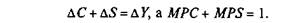 Если доход возрастет, то часть этого прироста будет направлена на потребление, а другая часть — на сбережение. Поскольку третьего варианта нет, то сумма изменения потребления С и сбережения должна быть равна изменению дохода: