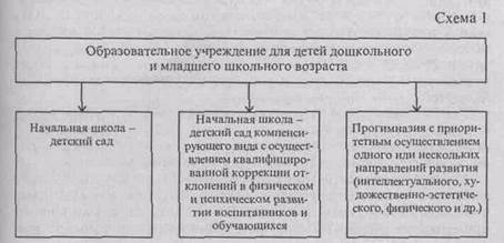 Образовательные учреждения общего типа создаются для детей с 3 до 10 лет. Основная цель учреждения - осуществление образовательного процесса путем обеспечения преемственности между дошкольным и начальным общим образованием, оптимальных условий для охраны и укрепления здоровья, физического и психического развития детей (см. схему 1).
