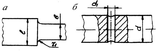 Рис. 4. Детали с типовыми концентраторами напряжений: а – переход от меньшего размера b к большему l, радиус сопряжения r 1; б – поперечное отверстие диаметром d 1