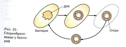 Прокариоты размножаются бесполым путем, а именно делением клетки надвое. Половой процесс, т. е. процесс обмена генетическим материалом, у прокариот встречается значительно реже. Многие прокариоты, например бактерии, в неблагоприятных условиях способны образовывать споры. При этом содержимое бактериальной клетки сжимается, и вокруг него выделяется плотная оболочка. После этого прежняя бактериальная клетка разрушается, и спора выходит наружу (рис. 31).