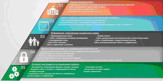 Можно выделить следующие категории контента, которые подвергаются фильтрации в различных странах мира: политический контент; социально-опасная информация; контент, связанный с национальной безопасностью; сайты и сервисы, нарушающие экономические интересы; специализированные интернет-инструменты и социальные сервисы;