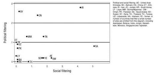 Ниже представлена диаграмма из книги Access Denied: The Practice and Policy of Global Internet Filtering5, показывающая распределение стран по шкале социальной и политической фильтрации интернет-контента: