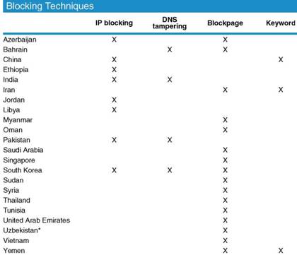 Ниже представлена таблица из книги Access Denied: The Practice and Policy of Global Internet Filtering7, в которой обозначено использование различными странами указанных методов фильтрации интернет-контента: