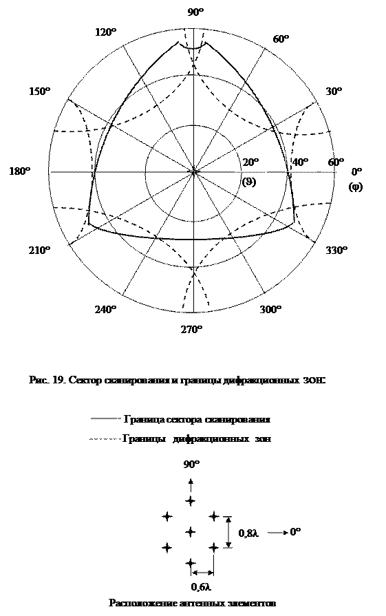 Уровень согласования раскрыва решетки с пространством в полосе частот порядка нескольких процентов от центральной частоты характеризуется коэффициентом отражения по мощности ~ 0,1. Следует иметь в виду, что периоды размещения элементов в раскрыве решетки сантиметрового диапазона обычно превышают половину рабочей длины волны l/2. При этом в пределах сектора сканирования лучом в пространстве над решеткой возникают дополнительные дифракционные лучи. В качестве иллюстрации на рис. 19 приведен сектор сканирования (± 45° по азимуту и от 0 до 80° по углу места) и обозначены границы появления дифракционных лучей для решетки с гексагональным расположением элементов с периодами 0,6l по горизонтальной и 0,8l по вертикальной осям (расположение элементов в раскрыве АФАР показано на рис.2). Полотно АФАР наклонено относительно вертикали на 30°, относительная частота f/f0 = 1.