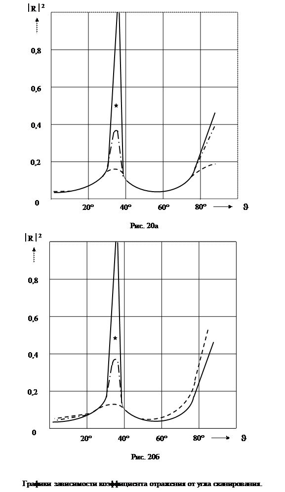 На рис. 20а, 20б показаны графики зависимости от угла сканирования J коэффициента отражения по мощности ½R½2, усредненного по элементам решетки плоских волноводов с металлическим фланцем. Период решетки равен 0,635 l, вектор электрического поля перпендикулярен стенкам волноводов. Сплошная кривая на рисунках соответствует бесконечной периодической решетке. Рис. 20а соответствует конечной периодической решетке из 11 элементов (штриховая линия), из 25 элементов (штрих-пунктирная линия), звездочкой обозначено значение коэффициента отражения в области резонанса для решетки из 49 элементов. Средний коэффициент отражения 11-элементной решетки в области резонанса не превышает 0,15, для 25- элементной решетки составляет ~0,35, а для 49 элементной ~ 0,5.