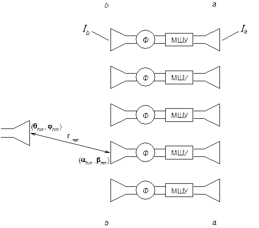 Определим мощность шума в выходном тракте приемного рупора АФАР, принятую от её nm -го антенного элемента. Пусть r nm — расстояние между nm -ым излучателем Ib и приемным рупором, a nm и b nm — углы, задающие направление от nm -го излучателя на рупор, J nm и j nm — углы, задающие направление от рупора на nm -ый излучатель (рис. 31).