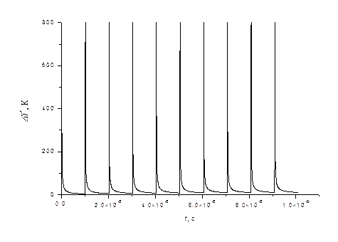 Рис. 1.22. Изменение во времени максимального перегрева DT* для структуры GaAs на GaAs.