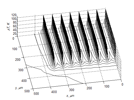 На рисунке 1.24 приведено трехмерное распределение температуры перегрева структуры нитрида галлия на карбиде кремния. Транзистор представлял собой периодическую гребенку и з 15-ти каналов шириной 700 мкм, длиной 0,3 мкм с шагом 50 мкм. Кристалл размещался на медном радиаторе 30х30х1 мм3. Выходной сигнал – импульсный с импульсной мощностью 200 Вт, длительностью импульса 5 мкс, скважностью 10.