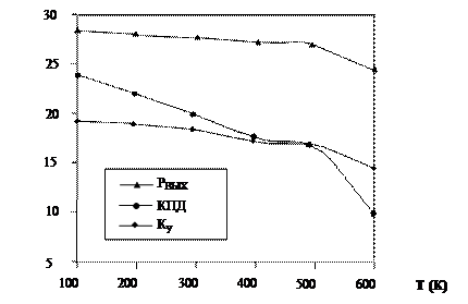 При дальнейшем увеличении температуры (от 500К до 600К) наблюдается более резкое снижение характеристик транзистора. Уменьшение значений выходной мощности КПД и коэффициента усиления в интервале температур (100 ¸600) К составляет:
