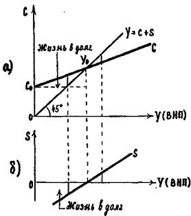 До достижения дохода Y0 потребление превышает доход ("жизнь в долг"),