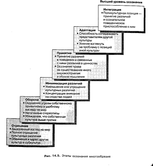 Чувствительность и открытость людей к «чужим» культурам сугубо индивидуальны. На рис. 14.5 представлена модель осознания разнообразия. Континуум простирается от полного отсутствия осознания многообразия до полного понимания и принятия различий между людьми. Основная цель обучения восприятию разнооб-