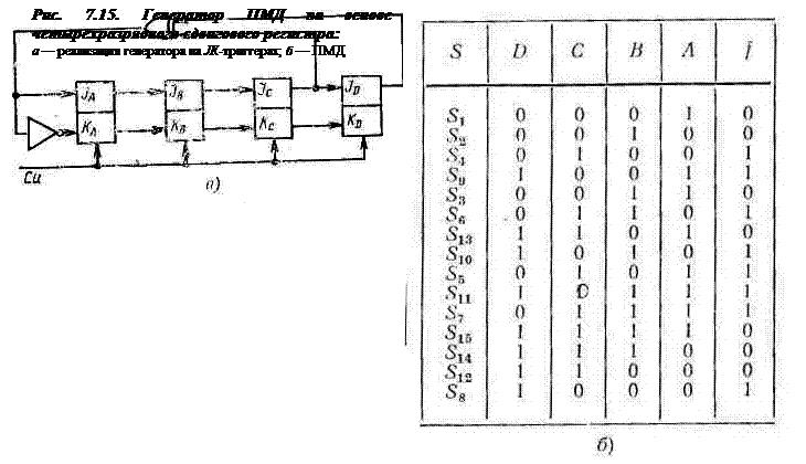 Анализ таблицы состояний четырехразрядного генератора ПМД, изображенной на рис. 7.15, б, показывает, что ==0, когда генератор находится в состоянии S 3, и, следовательно, следующим состоянием генератора будет S 6. Если же цепь обратной связи модифицирована так, что значение сигнала в ней равно 1, то следующим состоянием генератора будет S 7.