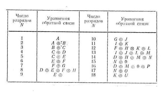 максимальная длина последовательности состоянии определяется следующим образом: l = 2 N-1, где N — число разрядов сдвигового регистра. Только определенным образом связав элемент ИСКЛЮЧАЮЩЕЕ ИЛИ с выходами триггеров, можно построить регистр с ПМД. В таблице на рис. 7.16 приведены выражения для функций обратной связи, использование которых позволяет сформировать ПМД. Число разрядов регистра изменяется в таблице от 1 до 18. Можно также сформировать другие ПМД. Например, если в цепи обратной связи четырехразрядного регистра стоит инверсия функции