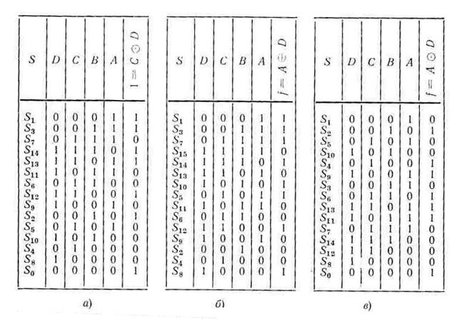 На рис. 7.20, а показана диаграмма состояний четырехразрядного генератора ПМД. Изменив обратную связь, можно добиться, чтобы состояния S 6, S 13, S 10, S 5 , S 11 не попадали в рабочую последовательность генератора. В результате, в последовательность будут входить только десять состояний из 15.