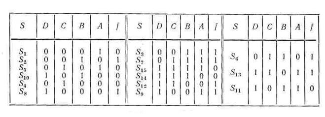 На рис. 7.20, б показана модифицированная последовательность состояний генератора, причем выделено новое значение функции обратной связи для состояния S 3. Функция обратной связи вместе с неиспользуемыми состояниями S 6, S 13, S 10, S 5 , S 11 и состоянием блокировки S 0 представлена с помощью карты Карно на рис. 7.20, в. Используя обычные методы упрощения, получим модифицированную функцию обратной связи в виде