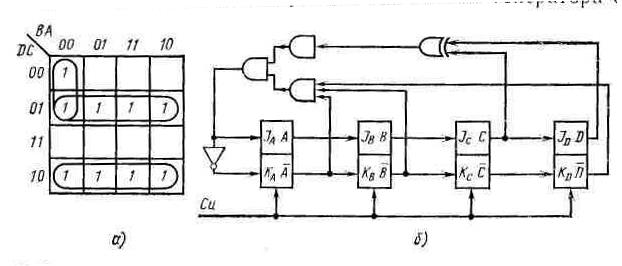 а - представление функции обратной связи с помощью карты Карно: б - реализация генератора ПМД
