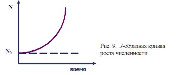 1. Экспоненциальный рост численности (J-образная кривая) (рис. 9):