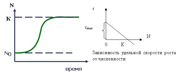 где Nt – численность популяции в момент времени t, N0 – численность популяции в начальный момент времени t0, е – основание натурального логарифма, r – показатель, характеризующий темп размножения особей в данной популяции (удельная скорость изменения численности). Если r > 0, то численность популяции растет, при r < 0 – сокращается. Экспоненциальный рост возможен лишь при отсутствии лимитирующих факторов. Такой рост в природе не происходит, либо происходит в течение очень непродолжительного времени (например, популяции одноклеточных организмов, водорослей, мелких ракообразных при благоприятных условиях размножаются по экспоненциальному закону). Это рост численности особей в неизменяющихся условиях.