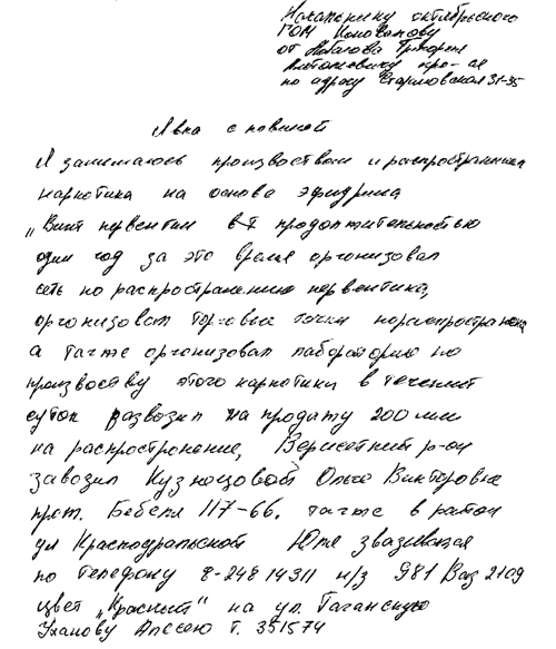 В середине октября 2001 года мы совершенно неожиданно получили огромный объем информации и ряд ценных документов, которые позволили нам понять, как выглядит схема торговли первитином в нашем городе. На верху пирамиды находятся некто Сергей Лебедев (ныне Эдигер, 3 судимости) и его жена Яна, которые торговали наркотиками на углу Комсомольской – Малышева еще в начале 90-х. Сейчас они живут во Франкфурте.