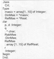 • вместо описания самих динамических переменных в программе даются описания указателей(статических переменных ссылочного типа) поставленных в соответствие динамическим переменным;