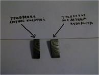По ходу эксперимента дамаск протравливали в разных составах. Первый образец - в растворе азотной кислоты с 10% концентрацией. Второй - в растворе азотной кислоты с концентрацией 3%. Третий – в растворе железного купороса. Четвертый – в ржавчине, образованной на поверхности куска дамаска, помещенного в воду на сутки. Полученные результаты представлены в таблице 2 и рисунках 19, 20.
