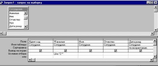 - в строке «Условие отбора» в столбце Фамилия ввести условие Like "C*". Перед вводом буквы С перейти на русский шрифт;