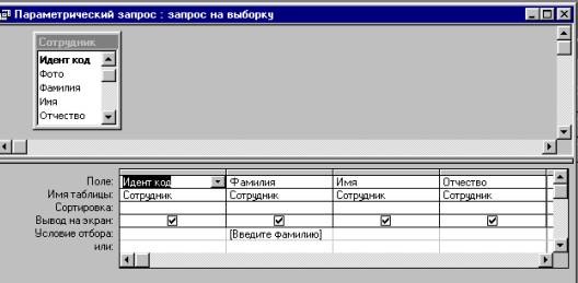 В столбце Фамилия в строке Условие отбора ввести в квадратных скобках [Введите фамилию] (сообщение, которое будет выводиться на экран при выполнении запроса). Выбрать из меню Запрос подпункт Параметры. В появившемся окне Параметры запроса в столбце Параметр ввести то же сообщение без квадратных скобок. В столбце Тип данных выбрать тип Текстовый. Закрыть запрос, на вопрос о сохранении ответить положительно, сохранить запрос с именем Идент код.