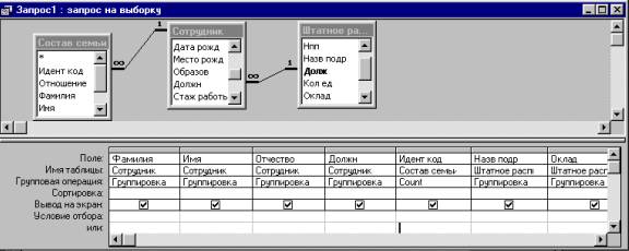 Из первой таблицы выбрать поля Фамилия, Имя, Отчество, Должность. При помощи мыши переместить на бланк запроса. Из второй таблицы выбрать поле Идент код, поместить его на бланк запроса. Из третьей таблицы выбрать поля Назв Подр и Оклад и также поместить их на бланк.