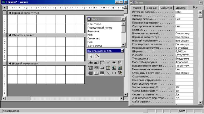 Перемещая окна (отбуксировав мышкой за заголовок) можно расположить их в удобном для работы порядке, например: Окно отчета - слева, Список полей в правой области экрана, ниже - Панель элементов.