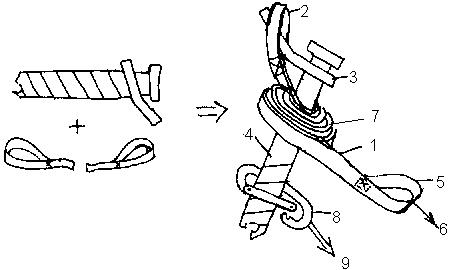 кусок тонкой жесткой стропы 1 (в крайнем случае - репшнура) с петлями по концам - одна (2) продевается в ушко серьги 3 ледобура 4, а вторая (5) крепится последним спускающимся к сдергивающей (вспомогательной) веревке 6. Длины куска должно хватать на столько оборотов, сколько делают при завертывании ледобура в лед, плюс 1-2 запасных (около 3 м). Надо стремится к тому, чтобы получившаяся бухта 7 была как можно тоньше и располагалась как можно ближе к серьге 3 ледобура. Многие крепят на ледобур два диска из дюраля (по краям получающейся бухты 7) - получается шкив для стропы, а также - дополнительную скользящую серьгу ниже бухты. Чтобы уменьшить вероятность самопроизвольного вывертывания, на стропу в конце стоит пристрочить широкую липучку. Предпоследний спускающийся ввертывает такой ледобур сквозь карабин 8, положенный прямо на лед, вщелкивает в серьгу 3 ледобура-самовыворота как сдергивающую веревку (лучше вспомогательную), так и основную спусковую 9, и спускается по основной веревке, расправляя сдергивающую на пути вниз. Последний перещелкивает основную (спусковую) веревку 9 из ушка серьги 3 ледобура в лежащий на льду карабин 8, а сдергивающую веревку - в петлю 6 стропы 1, поворачивает ледобур серьгой вверх, чем проверяет легкость вращения ледобура и препятствует самопроизвольному соскакиванию бухты стропы с ледобура, и спускается. Следует проявлять при этом особую осторожность со сдергивающей веревкой, т.к. вывертывание ледобура обычно происходит очень легко и вполне может произойти на крутом склоне при неаккуратном обращении с веревками или просто под весом сдергивающей веревки во время спуска последнего участника... Фактически, спусковая веревка 9 во время спуска последнего должна постоянно быть под нагрузкой. Если спуск и сдергивание производится половинками одной и той же веревки (см. рис., синяя половина веревки спусковая, красная - сдергивающая), то у середины веревки вяжутся два узла на необходимом расстоянии друг от друга (около двух метров, еще одна вещь, которую надо проверять перед спуском последнего), остальное - так же как и с двумя веревками. Эта простая система (без дополнительных шкивов и серьги) вполне надежна, легка по весу (надо только заранее приготовить стропу) и проста в изготовлении. Тем не менее следует помнить, что безопасность предпоследнего и особенно последнего участника все же понижена, и действовать очень аккуратно и внимательно. Что, впрочем, вообще нелишнее дело...