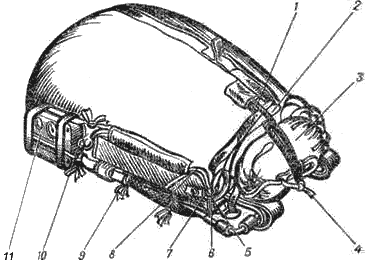 Рис. 15. Общий вид уложенного парашюта Д-6: 1 — сота резиновая; 2 — звено; 3 — парашют стабилизирующий в камере; 4 — лента зачековки; 5 — узел контровки петли звена к кольцу на ранце: 6 — кольцо на ранце; 7 — направляющее кольцо для фала; 8 — фал гибкой шпильки; 9 — лента-завязка; 10 — контровка гибкой шпильки с прибором; 11 — прибор ППК-У-165А-Д или АД-ЗУ-Д-165