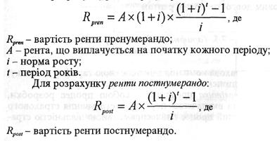 Под рентой понимают периодические выплаты или взносы, которые выполняются в начале или в конце обусловленного периода (месяца, квартала, полугодия, года).Если расчеты за рентой выполняются в начале каждого периода, то рента называется пренуме-рандо, если в конце периода - то постнумерандо. Для этого используют формулы: