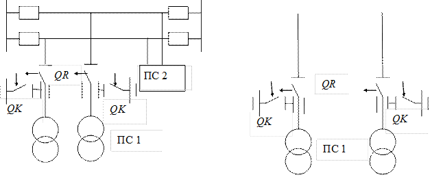 В первом случае аппарат называют короткозамыкателем (QK), во втором случае – отделителем (QR). Эти аппараты обычно используются в сочетании друг с другом на стороне высокого напряжения неответственных отпаечных (рис 5.10 а) и тупиковых (рис 5.10 б) подстанций с трансформаторами мощностью до 25МВА вместо выключателей.